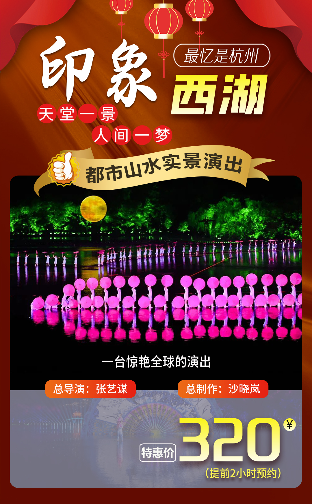 印象·西湖是“铁三角”继印象·刘三姐、印象·丽江后又一部“印象”系列实景演出,音乐由日本音乐家喜多郎担纲,张靓颖主唱。印象·西湖是由杭州市委市政府、浙江播广电视集团及浙江凯恩集团共同组建的“印象西湖文化发展有限公司”打造的一台大型山水实景演出。 由著名导演张艺谋、王潮歌、樊跃“铁三角”导演团队联手打造的山水实景演出。