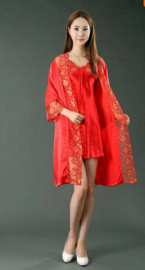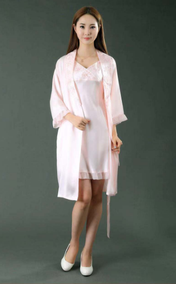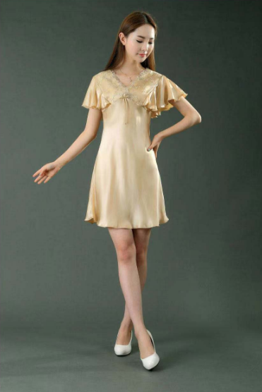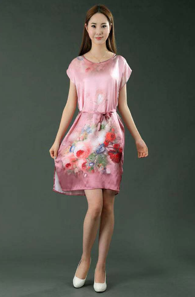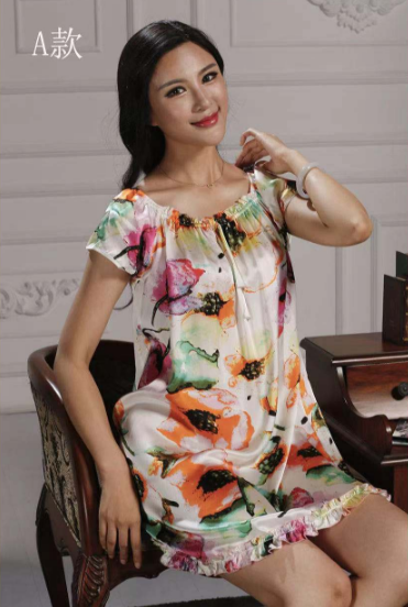 桑蚕丝圆领系带宽松裙真丝喷绘睡裙