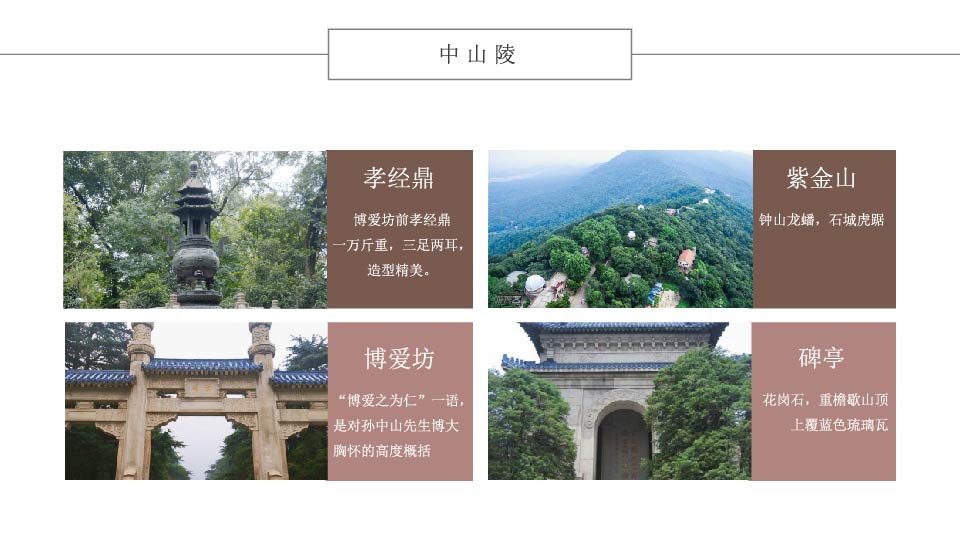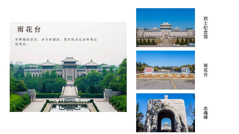| 13:00 | 游玩景点:中山陵或雨花台 【中山陵】(游览时间约1.5小时)孝经鼎、博爱坊、陵门、碑亭,登紫金山,鸟瞰金陵城,感受龙盘虎踞之势(周一闭馆);或游国家AAAA级风景名胜区——【雨花台】(周一闭馆,游览时间约60分钟)看烈士群雕像、纪念碑、纪念馆、雨花阁、雨花名胜古迹区、忠魂亭广场等景点,瞻仰革命 |
