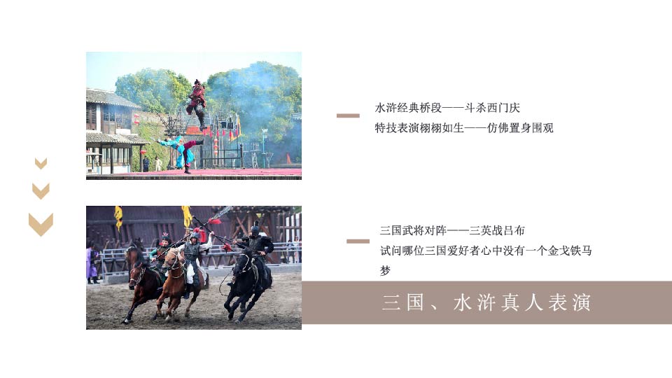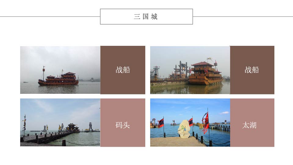 | 8:30 | 游玩景点:三国城 【三国城】央视影视基地(游览时间约1小时),看三国人物群雕像、汉鼎、桃园、吴王宫(聚贤堂可看表演、孙尚香洞房)、吴营水寨乘古战船游太湖(视天气条件而定)、曹营旱寨、跑马场观大型实景演出《三英战吕布》、自主游乐区等。 |