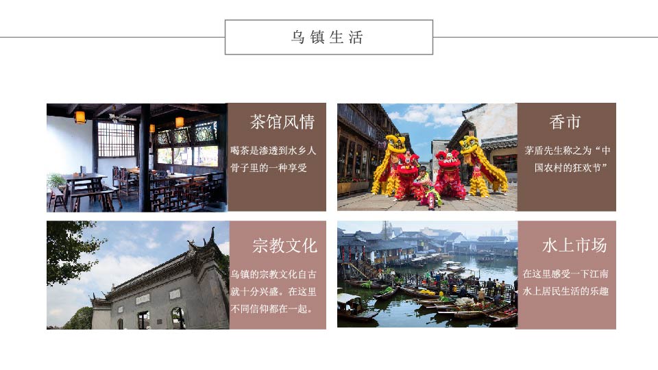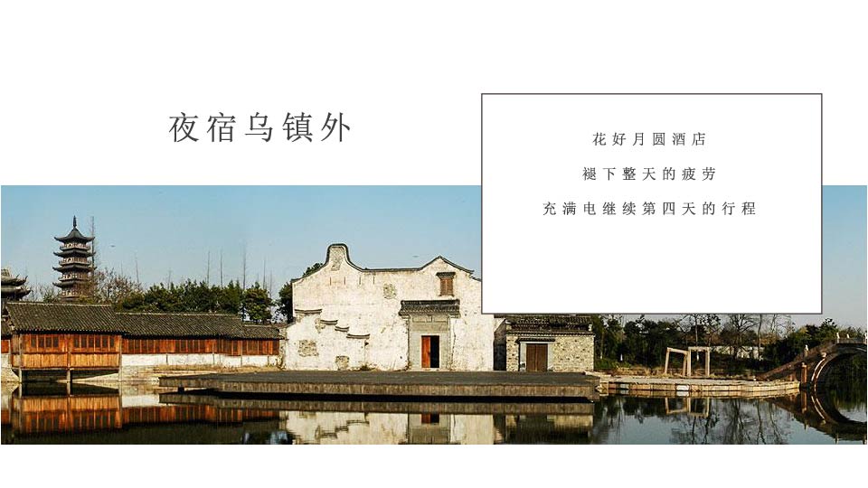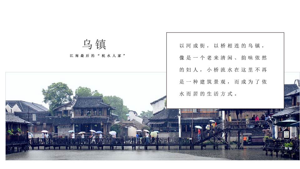 | 16:00 | 游玩景点: 乌镇东栅 乌镇东栅,游览江南最后的“枕水人家”、电视剧《似水年华》拍摄地 (游览时间约1.5小时)走逢源桥让您左右逢源,品味江南最原生态的枕水人家, |