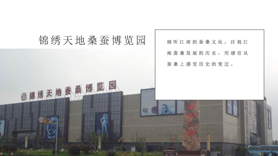 | 08:00 | 赴【江南工坊】(参观120分钟),参观【锦绣天地桑蚕博览园】(参观90分钟) |