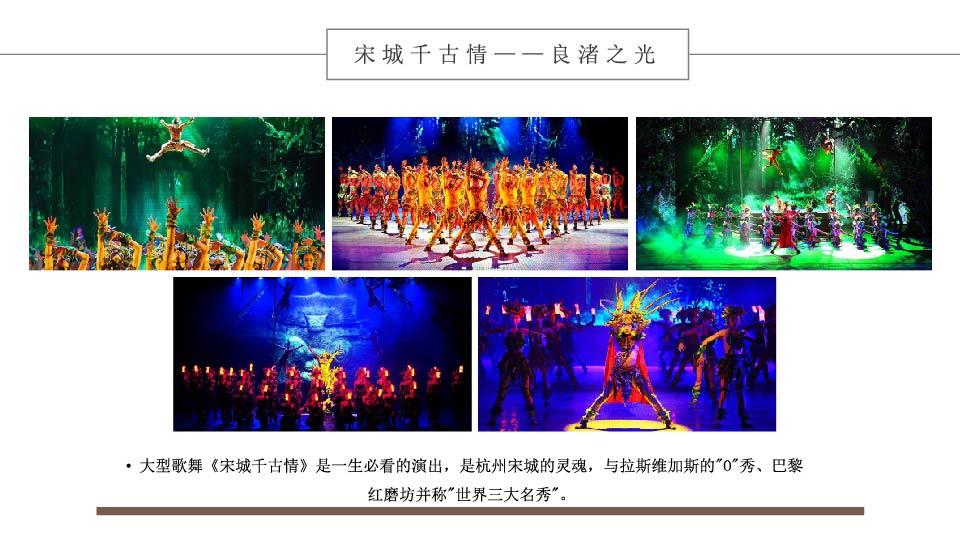 | 18:00 | 游玩景点: 宋城千古情(含演出) 赠送【宋城千古情(含演出)】观江南民俗,去鬼屋探奇,逛怪街寻秘;抢绣球、耍杂技、和燕青一起打擂;再现南宋风情,置身清明上河图;宋城,到杭州不可不去的天上人间。欣赏斥资六千万巨资打造的“给我一天,还你千年”大型歌舞表演—【宋城千古情】 |