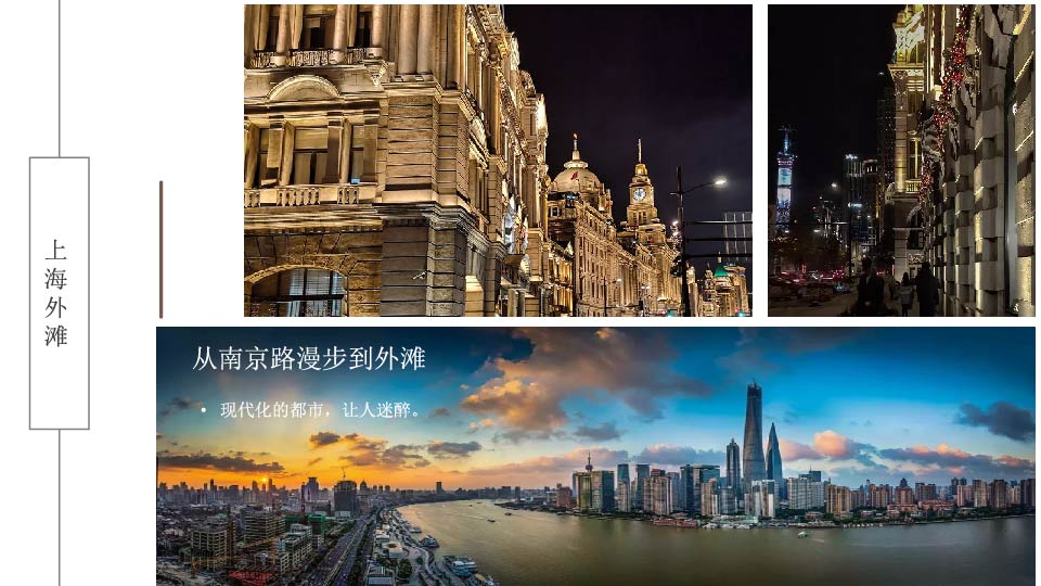 | 14:30 | 游玩景点: 南京路、外滩 游十里洋场、中国最繁华的商业街——【南京路】(游览时间约1.5小时)鳞次栉比的商店、车水马龙的街道、各具特色的欧式建筑“和平饭店、钟楼、中银大厦”等万国建筑博览群映入眼帘,游万国建筑博览的——【外滩】(30分钟),黄浦江风光! |