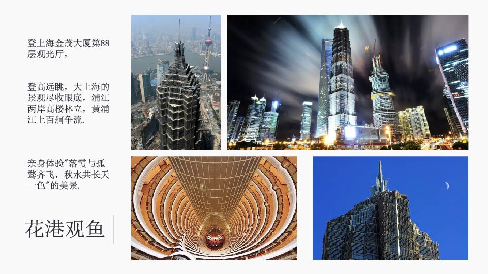 | 16:00 | 游玩景点:金茂或环球金融中心 赠送登A【金茂大厦】或B【环球金融中心】:登上海金茂大厦第88层观光厅,登高远眺,大上海的景观尽收眼底,浦江两岸高楼林立,黄浦江上百舸争流,您可亲身体验"落霞与孤骛齐飞,秋水共长天一色"的美景, |