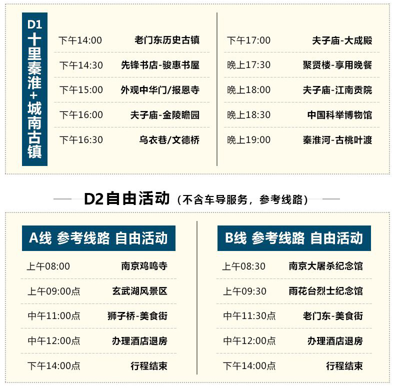 | 第一天 十里秦淮 | 用餐:不含 | 酒店:南京 | ||||||||||||||||||||||||||||||||
