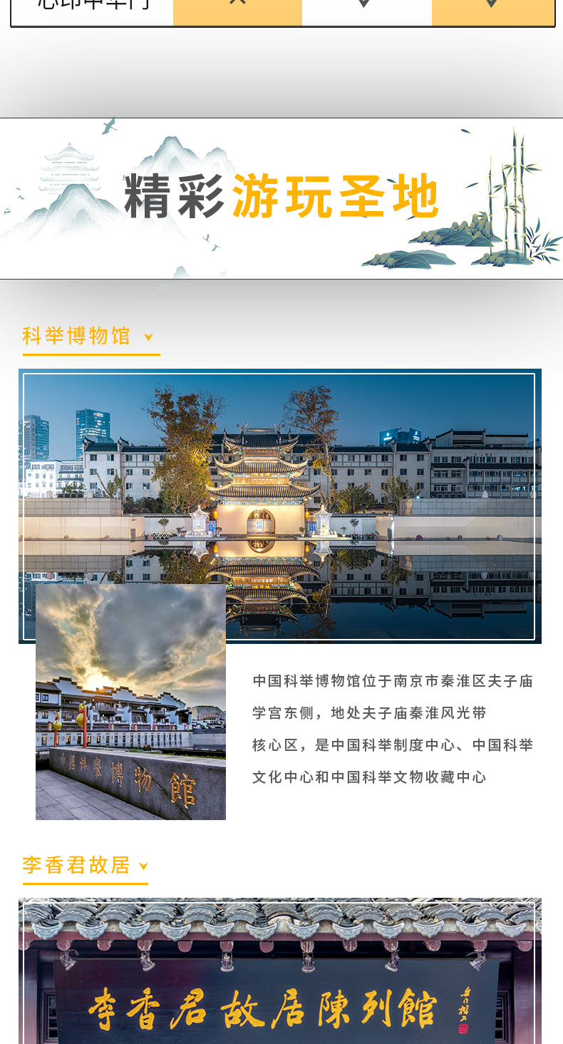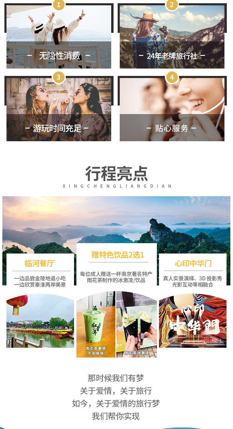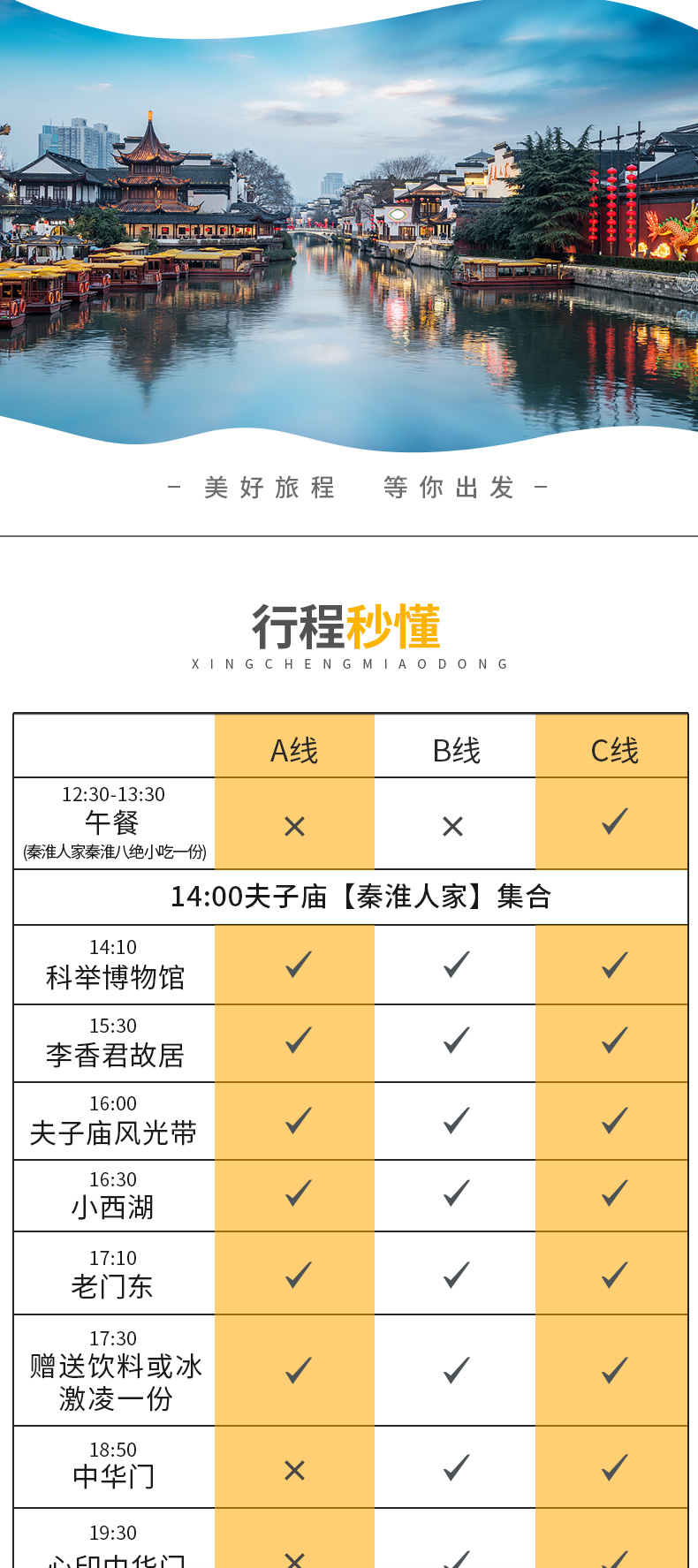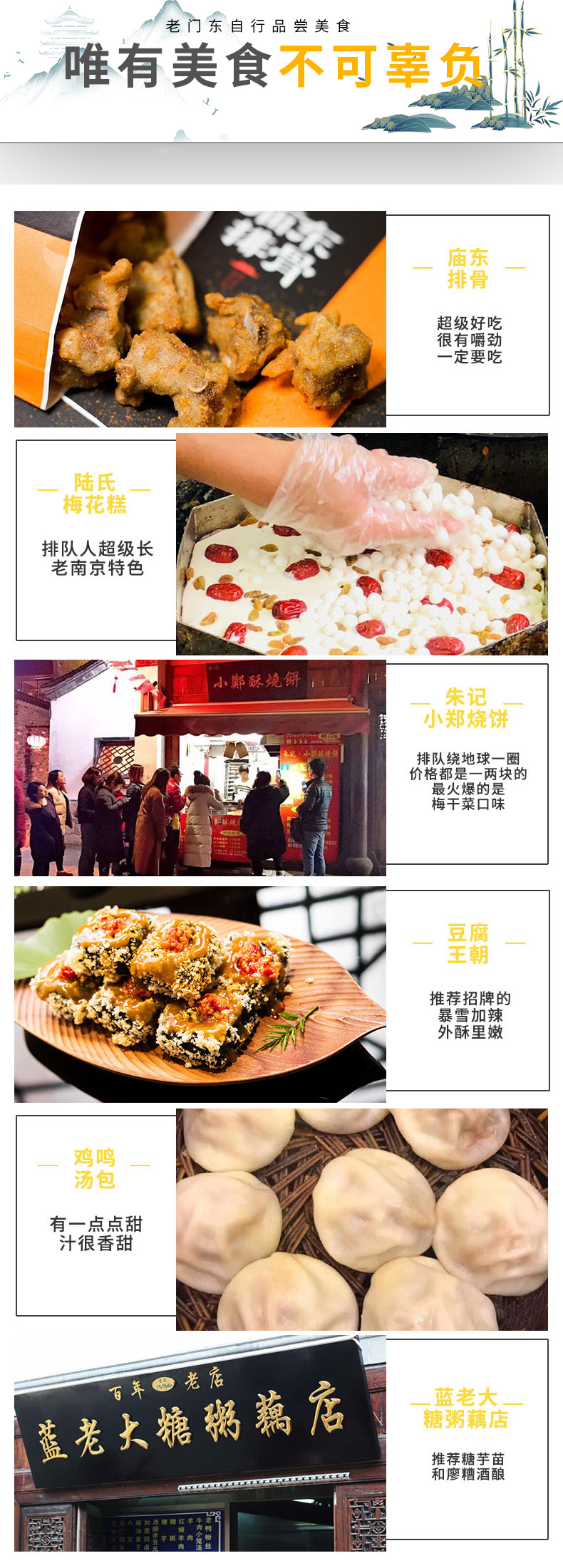 16:00【夫子庙秦淮风光带自由活动】:AAAAA级集庙、市合一的综合景区,是中国最大的传统古街市之一,历年节假日流量排全国前三,这里见证了南京人游、购、娱多元的丰富生活,这里既有南京老字号新体验,也有非遗小吃遍布街头巷尾,更有古今文化历史遗迹林立在秦淮河两岸(老万宝、李香君故居、乌衣巷、文德桥、天下文枢、奇芳阁、神州第一照壁等) 【老万宝门口解散与集合】