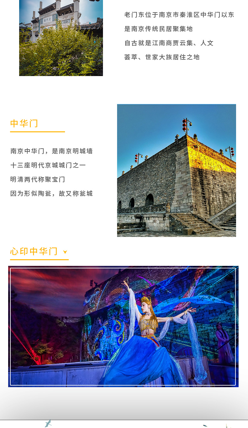 19:30【中华门灯光秀】《心印·中华门》大型沉浸式光雕艺术演出项目位于南京中华门,是由良业科技集团股份有限公司打造、新锐导演刘洲铭执导,以中华门的历史为轴线,通过真人实景演绎、3D 投影秀、光影互动等相融合,将其建筑价值、精神价值与文化价值一一传递给观众,引出众心之愿、国魂之尊、德才和众三大主题,点颂出“和合中华”的理念,再现中华门的前世今生。项目巧用光影科技将 600余年的中华门“活化”于当下,用光影创意科技赋能,巧妙转化为三大夜游沉浸式体验空间,让无名或有名守城人精神护佑下的国泰民安,照映在城墙,点亮在心间。