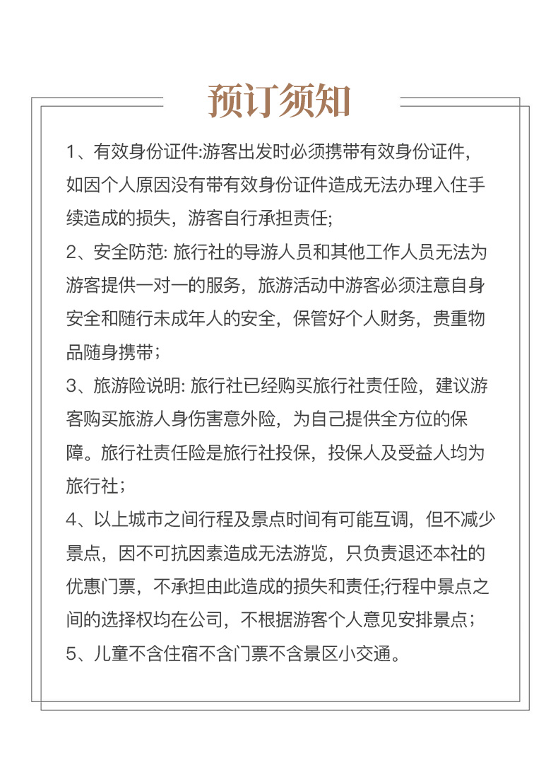 4.本产品中所含门票已为景区优待价,持各类证件的游客将不再享受额外的景区门票优惠政策。 若因未出示或使用伪造证件导致的一切责任及后果应由游客自行承担。